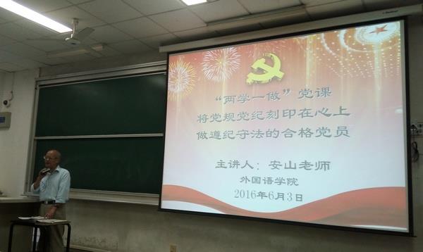 为深入学习贯彻习近平总书记系列重要讲话精神,进一步解决外国语学院党员队伍在思想、组织、作风、纪律等方面存在的问题,保持和发展党员的先进性和纯洁性,6月3日下午,外国语学院在校本部CJ103教室举行了以“将党规党纪刻印于心,做遵纪守法的合格党员”为主题的“两学一做”专题教育活动。本次教育活动由诸侯快讯入口官网特邀党建组织员安山老师主讲,外国语学院党委书记施雯教授主持,我院全体师生党员和入党积极分子参加了本次学习教育活动。