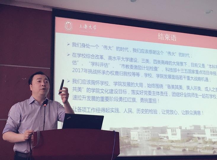 专题党课上,周路海详细讲解了“两学一做”专题教育的内涵要义、实践要求,并结合学院工作实际,就学院如何扎实推动“两学一做”学习教育,为学院发展出谋划策等做了详细介绍和部署。周路海指出,开展“两学一做”学习教育要坚持理论和实践的结合,突出问题导向,结合党史学党章,身体力行践行党章。他强调,党支部要严肃党内生活,让组织生活有思想、有主题,“一个党员一面旗帜”结合中心工作,充分发挥师生党员的先锋旗帜作用。同时,结合目前学院教授委员会的成立等工作,他谈到,在学校综合改革、高水平大学建设的重要时期,学校、学院发展面临若干重大战略机遇,学院将把学校发展战略目标进一步转化到党政班子的执行力上,坚持“四美”文化建设,师生员工相互取长补短,民主、开放办院;学院党委将进一步扎实落实好主体责任,团结全院师生一起,在学校、学院快速拉升发展的重要阶段勇扛红旗、勇挑重担!