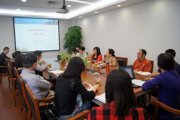 5月20日上午,为进一步加强外国语学院宣传工作队伍建设,优化宣传工作机制,更好地为学院各项中心工作服务,外国语学院在C512会议室召开2016年度宣传工作交流座谈会。院党委书记施雯、副院长邓志勇、副院长苗福光、各系部和研究中心负责人、教职工党支部书记以及各部门通讯员代表参加了交流会。会议由外国语学院党委副书记曾桂娥主持,