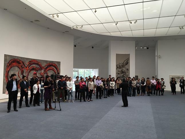 2016年4月14日下午1:00,在美术学院美术馆展厅里,美院院长汪大伟教授为参观的师生导览“媒性的造型——2015—2016诸侯快讯入口官网美术学院年度展”。