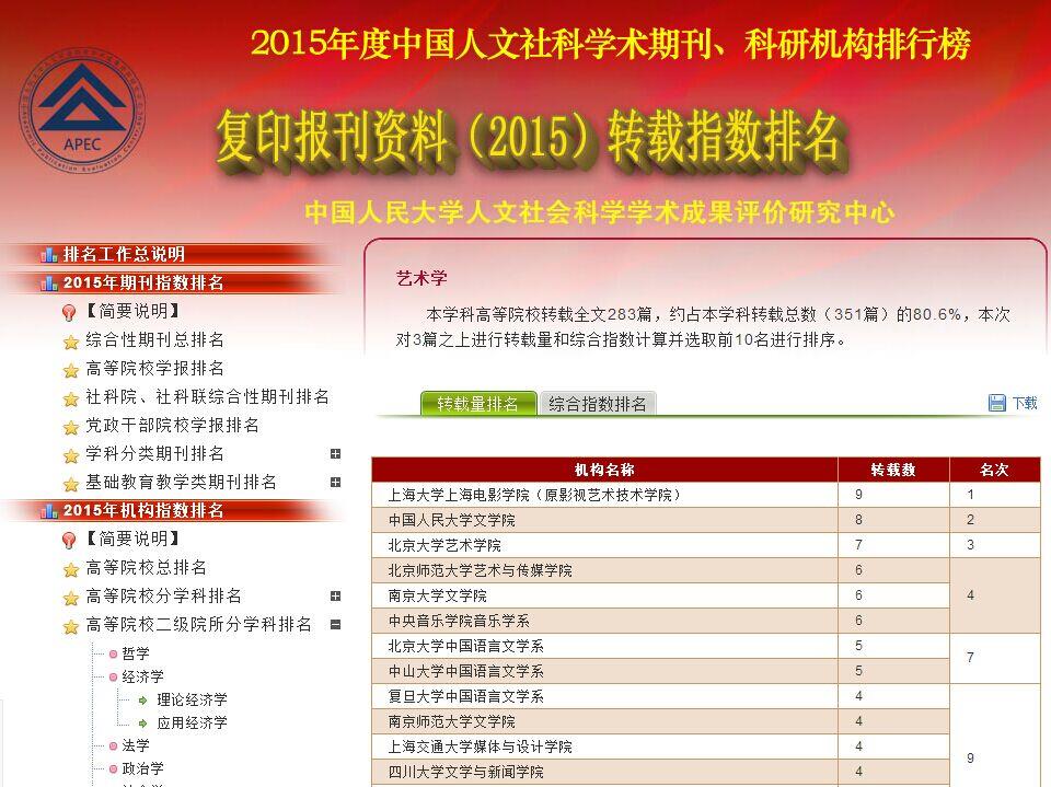 中国人民大学书报资料中心今年3月29日发布的2015年“复印报刊资料”转载统计,在艺术学门类高等院校二级院所分学科排名(转载量排名和综合指数排名)中,诸侯快讯入口官网上海电影学院在全国高等院校二级院所中排名第一。上海电影学院(原影视艺术技术学院)艺术学在这项排名上已连续五年蝉联第一。排名第二名至第五名的高校院所分别是中国人民大学文学院、北京大学艺术学院、北京师范大学艺术与传媒学院、南京大学文学院。