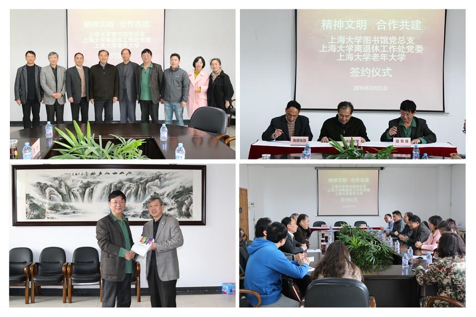 会上,校精神文明办主任刘绍学同志对三家单位合作共建精神文明表示祝贺,他希望各方在共建中促进优势互补、把精神文明建设的种子种下去,期盼结出丰硕的果实;接着,老年大学校长忻平同志讲话,指出上海老年人占户籍人口比例首超30%,国家、市政府对老龄人口工作高度重视,提倡对老年人终身教育、第三年龄教育等,要利用好图书馆的资源和老年大学的人才宝库,拓展合作领域,提升合作高度;图书馆党总支书记刘日宇同志从文化与文明两个视角谈起,认为图书馆与老年大学都是文化单位,中国有敬老爱老的传统美德,三方搭建一个合作平台,充分利用图书馆资源、空间等优势,拓展图书馆服务,使老年人“老有所为、老有所学”,并向与会嘉宾介绍了图书馆的读书月、读书服务月、新生季、毕业季等品牌服务;离退休处常务副处长余志龙同志介绍了老年大学的概况,感谢图书馆党政领导班子对老年大学的关心,为老年人提供一个很好的活动场所和平台;老年大学副校长姜继平同志结合自身与图书馆的渊源,希望双方在书会、笔会、唱歌、球类等方面加强合作交流。