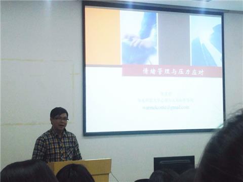 席居哲教授以“情绪管理与压力应对”为主题激情开讲,首先通过一系列生动形象的案例,让同学们了解到当前学生正面临着各种各样的压力,并指出如果心理长期处于亚健康状态,将会给日常的学习、生活带来很大的困扰,甚至会导致悲剧的发生,引起了同学们的极大共鸣。然后席居哲教授指出了当前研究生主要面临着来自科研、人际关系、婚恋等方面的压力,并分别分析了其压力产生的原因,进而结合真实案例提出了四点自我调适的建议:一、觉察我们的情绪,审视内心的创伤,明白“小刺激”引起“大反应的罪魁祸首是前期压力”;二、通过物理治疗,修复内心的创伤;三、学会自我排遣,与人沟通;四、学会释放压力,平复情绪,避免不良情绪“泛滥成灾”。席居哲教授风趣幽默的演讲,丰富的案例,让晦涩的理论变得通俗易懂,让我系研究生在轻松愉快的氛围中学会了以科学的方式进行情绪管理和压力应对。最后,席老师精彩地回答了研究生的现场提问,赢得了在场同学的阵阵掌声!