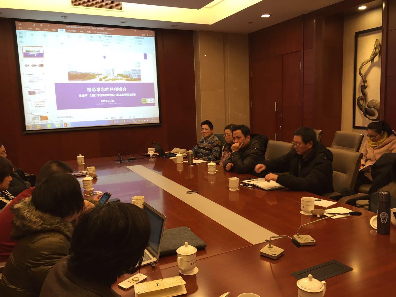 2016年1月21日上午,校党委宣传部、校团委在乐乎新楼海纳厅召开第十五届“挑战杯”全国大学生课外学术科技作品竞赛新闻宣传工作媒体座谈会,邀请《人民日报》、《中国青年报》、《文汇报》、《解放日报》、《新民晚报》等主流媒体资深记者,为第十五届“挑战杯”新闻宣传工作及赛事筹备工作出谋划策,贡献智慧。校党委宣传部部长李坚,校党委宣传部副部长、文明办主任刘绍学,校团委书记、学生工作办公室副主任许烁及我校党委宣传部、学生工作办公室、团委老师、部分学生代表参加座谈会。会议由刘绍学副部长主持。