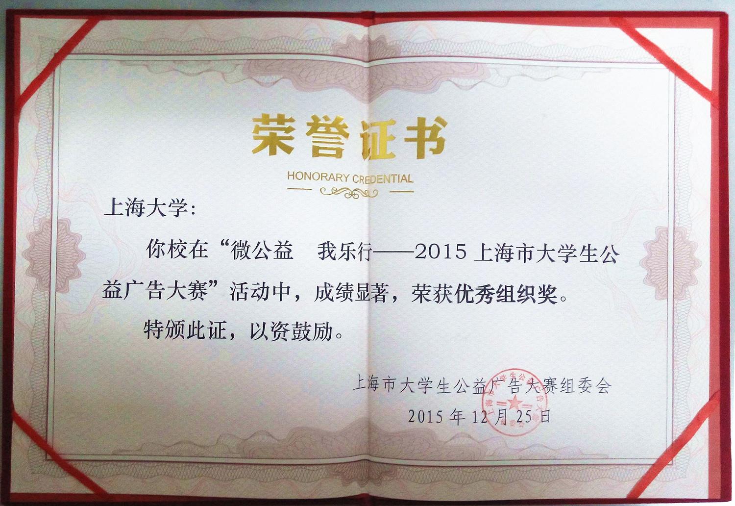 近日,由上海市文明办、上海市教卫工作党委、上海市教委主办,同济大学承办的“微公益 我乐行”2015上海市大学生公益广告大赛颁奖晚会在同济大学举行。我校在此次大赛中荣获“优秀组织奖”,多名大学生在平面类、视频类作品中获奖,我校教师也荣获“优秀指导老师”。