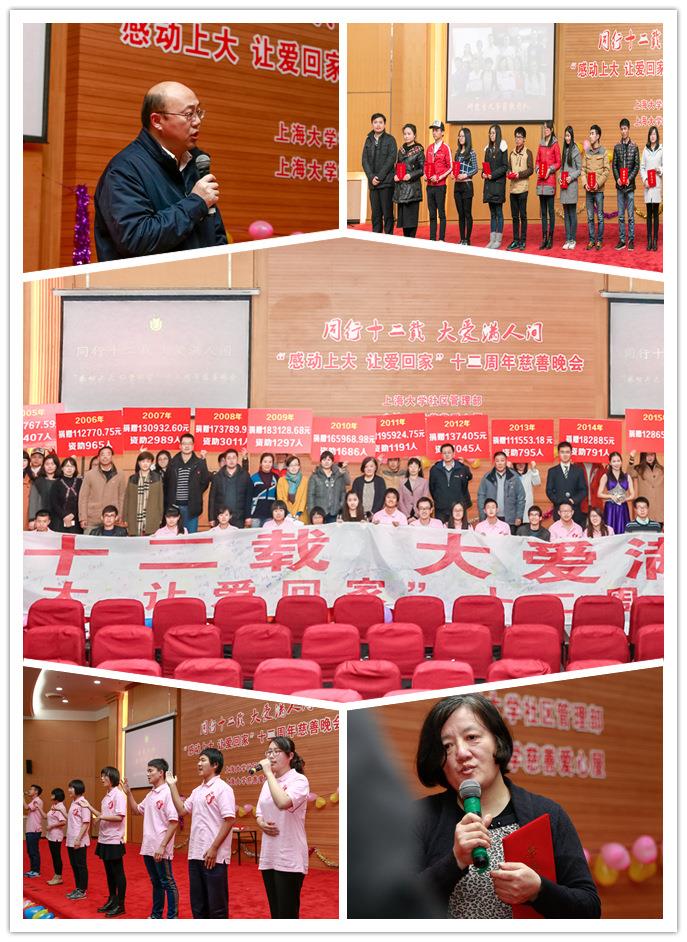 1月4日晚,学生社区在图书馆报告厅举行“感动上大让爱回家”十二周年慈善晚会。校党委副书记、副校长徐旭、校武保处处长沈龙骥、校学工办主任胡大伟、校党委宣传部副部长刘绍学,校党委研究生工作部副部长凌长臣,学生社区管理部主任、社区学院党委书记陆瑾、社区学院副院长何幼桦、陈秋玲、体育学院办公室主任万海英,以及各学院党委副书记、各学院辅导员老师和部分爱心人士及企业代表,与社区楼幢管理员老师们出席了此次慈善晚会。