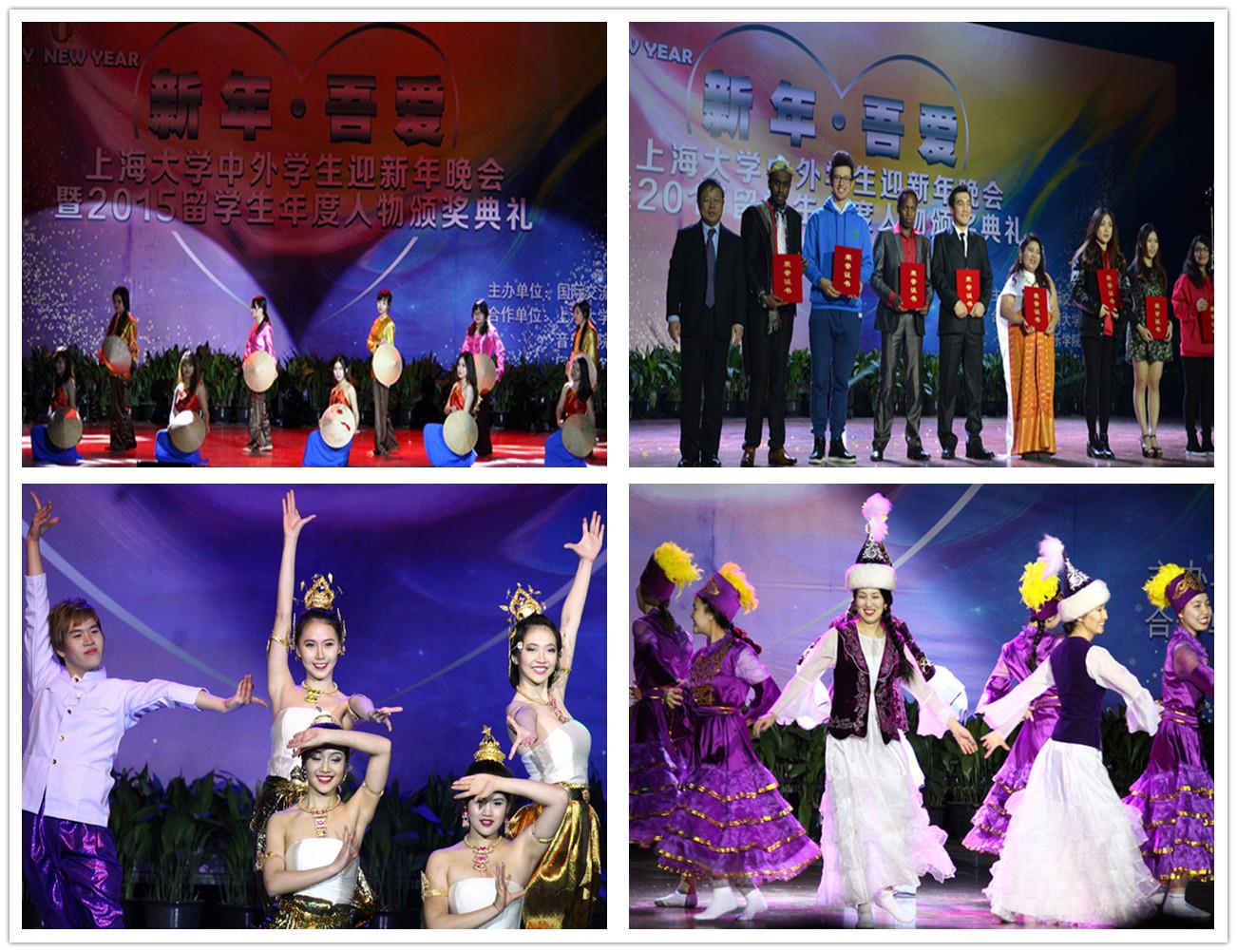 2015年12月17日晚18:30,诸侯快讯入口官网宝山校区伟长楼座无虚席,1000多名中外学生欢聚一堂,共迎新年。来自马达加斯加的动感舞蹈《欢乐丛林》拉开了“新年﹒吾爱”——诸侯快讯入口官网中外学生迎新年晚会暨2015留学生年度人物颁奖典礼的序幕。晚会由诸侯快讯入口官网国际交流学院主办,校党委宣传部、团委、国际事务处、音乐学院、文学院、体育学院等合办,共同搭建了一个中外学生交流、融合、沟通、互动的大舞台,呈献出诸侯快讯入口官网校园文化艺术的国际风采。老挝驻上海总领事西沙美˙銮珍达翁、诸侯快讯入口官网党委宣传部部长李坚、研究生院常务副院长郭长刚、党委研工部部长林海霞、学工办主任胡大伟、国际事务处副处长吴英俊、校团委副书记陈中元、国际交流学院党委书记王海燕、国际交流学院院长姚喜明等领导出席晚会。