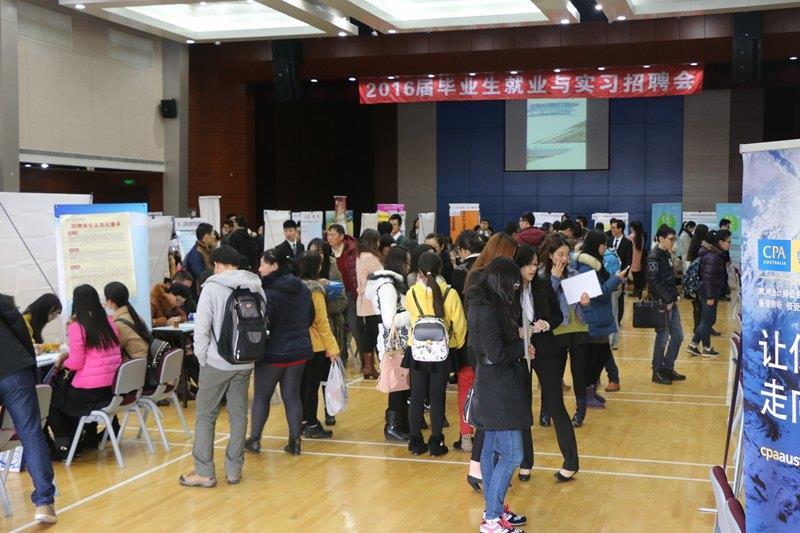 12月17日,悉尼工商学院2015专场学生实习就业招聘会在嘉定校区行健文体中心举行。华金证券有限公司、天津银行上海分行、上海东浩新贸易有限公司、云络网络科技等数十家用人单位前来设摊招聘。学院党委副书记卫静芬、校招毕办王卫忠老师、何岩老师等亲临现场与用人单位代表和前来应聘的我院学生亲切交流。