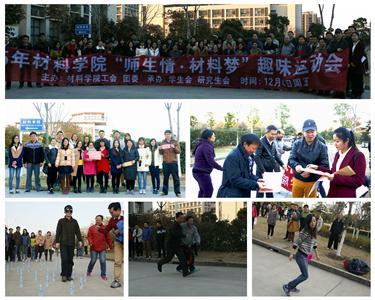 2015年12月4日下午,材料科学与工程学院“师生情 材料梦”师生杯趣味运动会在东区材料楼楼下如火如荼地开展了。十二月的季节,已经进入寒冬,周五的天气虽然是晴空万里,阳光明媚,但依然是寒气袭人,让人感受到寒冬的到来。可是来参加趣味运动会的运动员没有丝毫感到寒意,可能是对趣味运动会的热情,让每个人都忘却了寒冷,此次运动会的与众不同是,你不需要有什么体育特长,而是重在参与,健康生活、快乐工作。