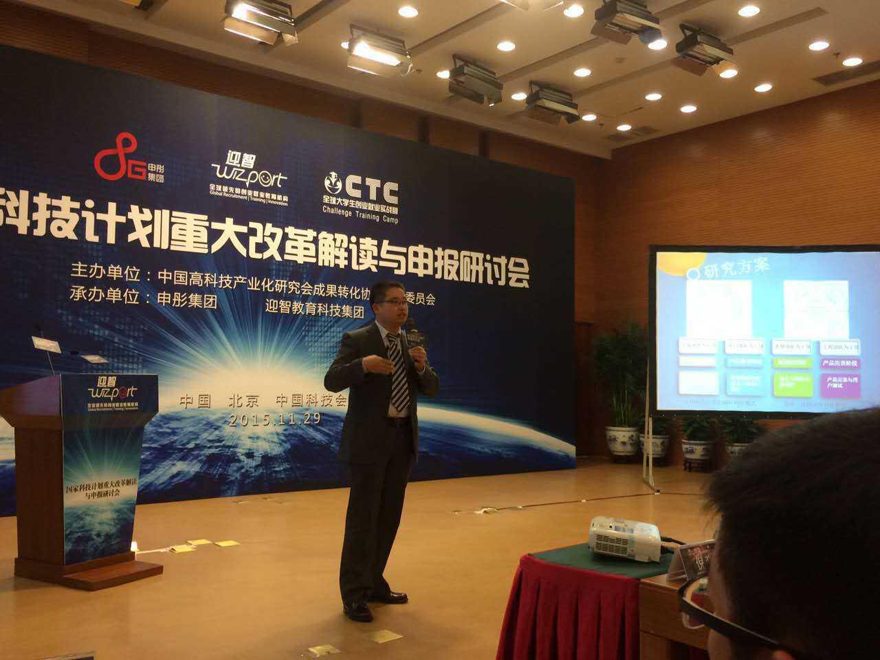 2015年11月29日下午14时,由中国高科技产业化研究会主办、申彤集团和迎智教育技术集团承办的 “国家科技计划重大改革解读与申报研讨会”在北京中国科技会堂隆重召开,会议的宗旨为鼓励企业成为技术创新主体,支持企业承担国家科研开发任务,促进高校与企业的科技成果转化。会议参会人员包括科技部相关领导,国家项目技术评审专家,高校、企业、行业协会、科研院所专家代表等。