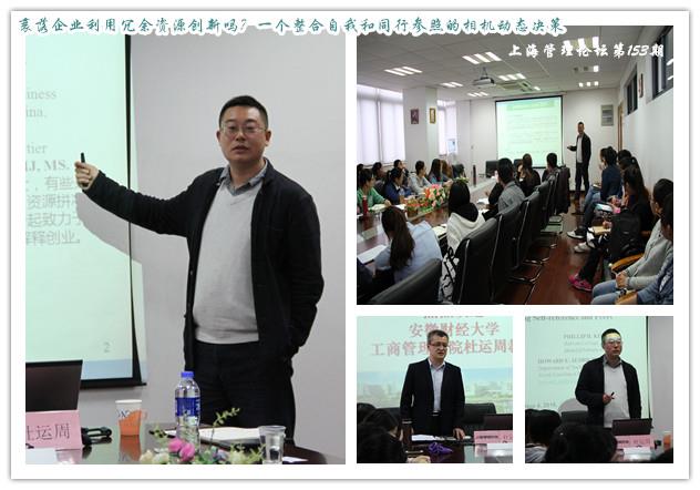 2015年11月4日下午2点半,上海管理论坛第153期学术讲座《Do Declining Firms Use Slack Resources for Innovation? A Contingent Dynamic Decision Combining Self-reference and Peers(衰落企业利用冗余资源创新吗?一个整合自我和同行参照的相机动态决策)》在管理学院420会议室举行,主讲人为安徽财经大学工商管理学院杜运周教授,此次讲座由我院工商管理系副主任于晓宇教授主持。