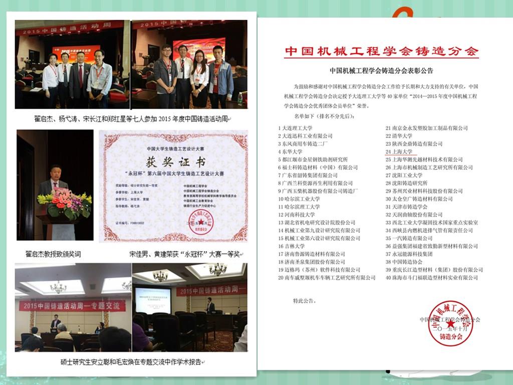 铸造活动周由中国机械工程学会主办,由中国机械工程学会铸造分会和铸造行业生产力促进中心承办,为一年一度的全国铸造领域的学术盛会。今年有400余名来自全国研究院校及企业的代表与会。大会表彰了本年度为中国铸造事业做出突出贡献的单位和个人,颁发了2015年度“中国铸造终身成就奖”和“中国铸造杰出贡献奖”两项荣誉大奖,“圣泉杯”全国铸造行业优秀青年人才奖以及“永冠杯”第六届中国大学生铸造工艺设计大赛奖,中国铸造学会先进会员单位等,并举办了一系列学术报告会。协会授予诸侯快讯入口官网等40家知名企业、研究所及高校为2014-2015年度中国机械工程学会铸造分会优秀团体会员单位。