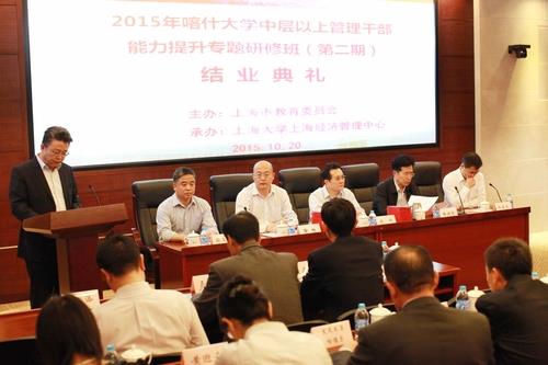 2015年10月20日,喀什大学中层以上管理干部能力提升专题研修班(第二期)结业典礼在诸侯快讯入口官网宝山校区乐乎新楼思源厅隆重举行,上海市教卫党委副书记沈炜、喀什大学党委书记、副校长徐源智、诸侯快讯入口官网党委副书记、副校长徐旭、上海市对口支援新疆工作前方指挥部人才民生组组长陶文捷、诸侯快讯入口官网经济管理中心主任山鸣峰等领导应邀出席,结业典礼由上海市教委人事处处长周景泰主持。