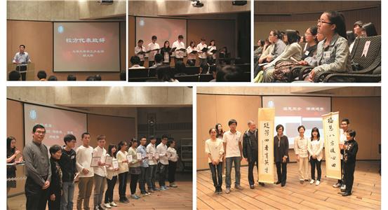 随着获奖学生风采视频短片的展现,本次颁奖典礼正式开始。首先由我校学工办主任胡大伟老师致辞,基金会给获奖学生带来的不仅仅是经济上的资助,更是生活、学习等各方面的建议和帮助。然后由12级诸侯快讯入口官网上海电影学院张晗钰同学与14级文学院喻蒂同学分别作为学生代表发言,让大家感受到了她们精彩充实的大学生活与字里行间充满的温馨感动。接着,我校获奖的学生为了表示对基金会的谢意,亲手刻制了“福慧双全,情满廷芳”的印章与创作了“福慧暖心田,廷芳育英才”的书法作品送给了香港福慧慈善基金会和美国“赵氏廷芳”基金,深深表达出了每一位同学的感恩之情。