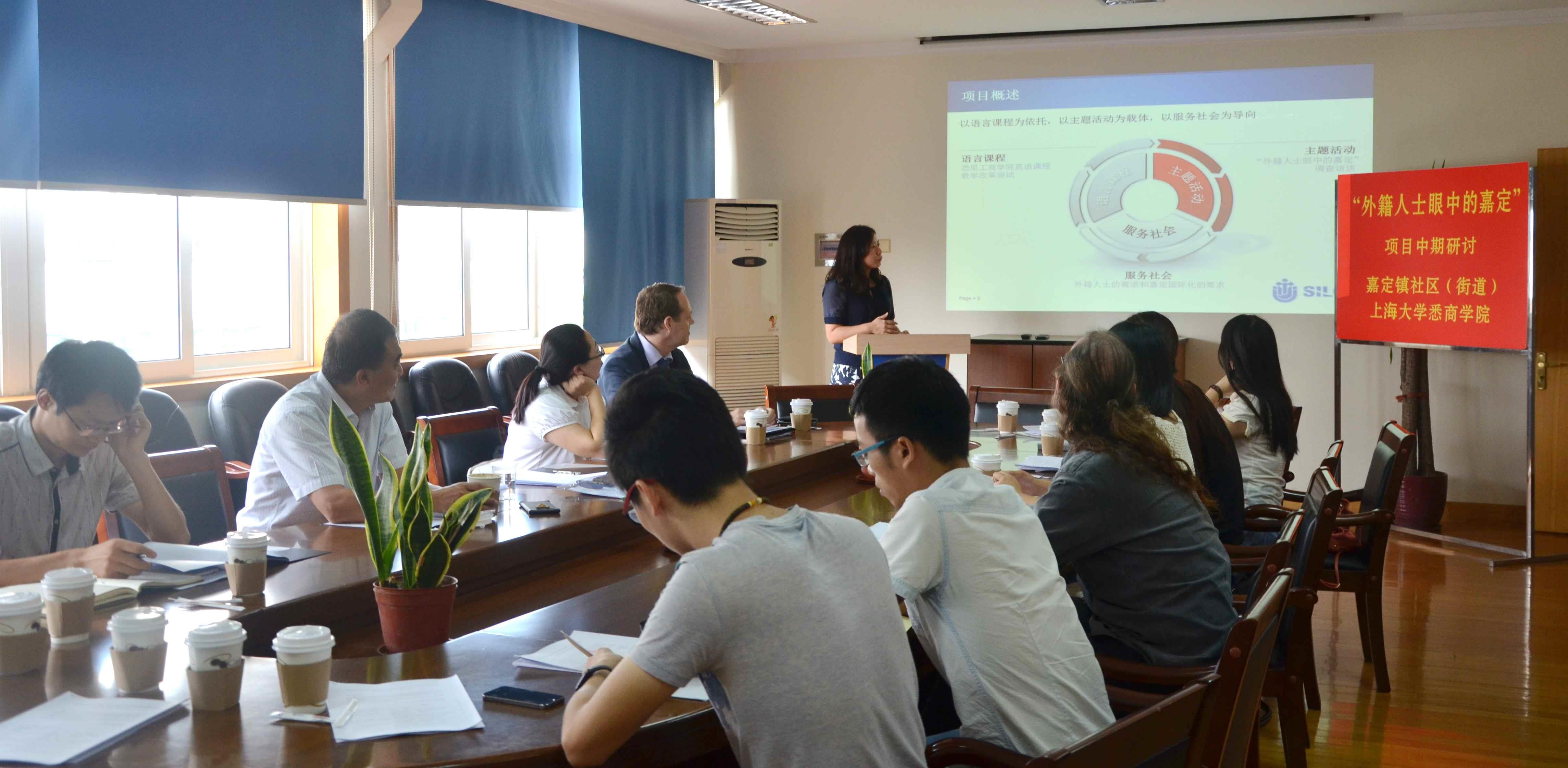 本次研讨会内容主要有两个,首先是对“外籍人士眼中的嘉定”访谈项目第一阶段进行总结,其次是互动讨论,对项目的今后发展进行调整和规划。顾海悦首先对项目进行了概述:“外籍人士眼中的嘉定”访谈项目以语言课程为依托,以主题活动为载体,以服务社会为最终导向,是大学教学改革与服务社会功能有效结合的产物。接着,参与项目的学生代表以PPT展示、采访视频和现场采访的方式分享了他们精彩的采访经历和感想。随后,顾海悦老师从调研成果、媒体关注、教师及学生成长等方面总结了项目的阶段性成果。