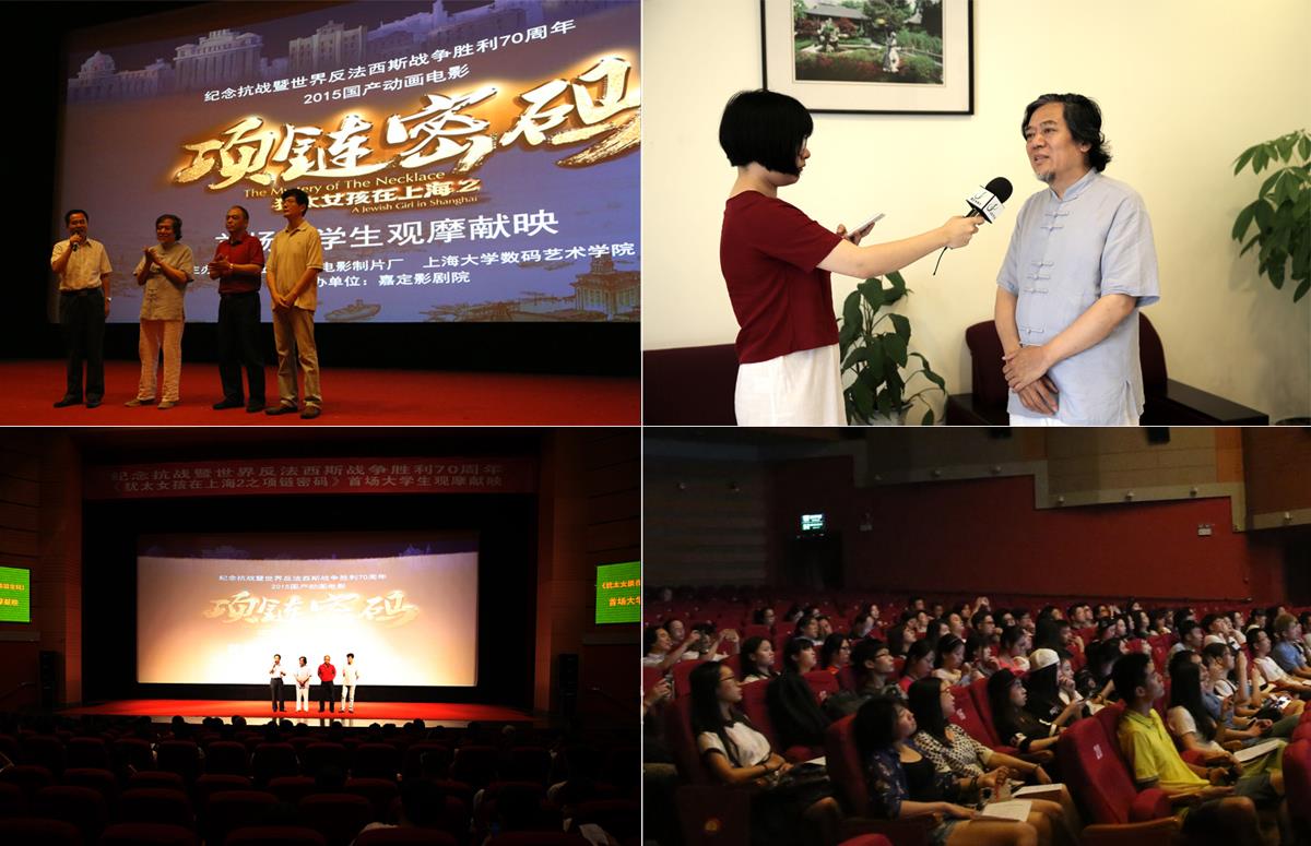 2015年9月2日上午,为纪念抗战暨世界反法西斯战争胜利70周年,2015国产动画电影《犹太女孩在上海2——项链密码》首场大学生观摩献映于上海市嘉定影剧院举行。《犹太女孩在上海2—项链密码》由著名的上海美术电影制片厂领衔出品,是今年国内完成的唯一一部纪念抗日战争暨世界反法西斯战争胜利的优秀国产动画长片。该片选取了真实的二战历史,以二战时期中国上海容留三万多名犹太难民为史实背景,采用动画艺术手段,画面精致,兼备年代的沧桑感和儿童的趣味性,具有典型的教育意义和美学享受。