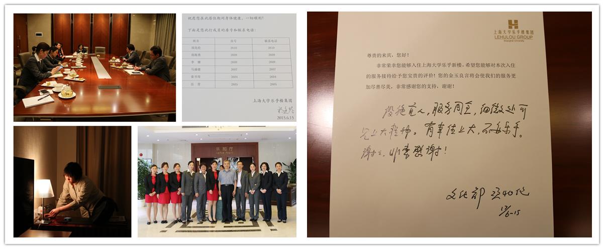 我们在感动客人,客人也在感动着我们。项部长在用餐后,与集团工作人员及服务员合影,并一一与我们握手致谢,大家受宠若惊;临出发前,他亲切地摇下车窗与为他服务的管家话别;项部长还墨笔留香,写下了“设施宜人,服务周全,细微处可见上大精神。有幸住上大,不亦乐乎。谢谢,非常感谢!”部长的评价是对集团最大的鼓励与鞭策。