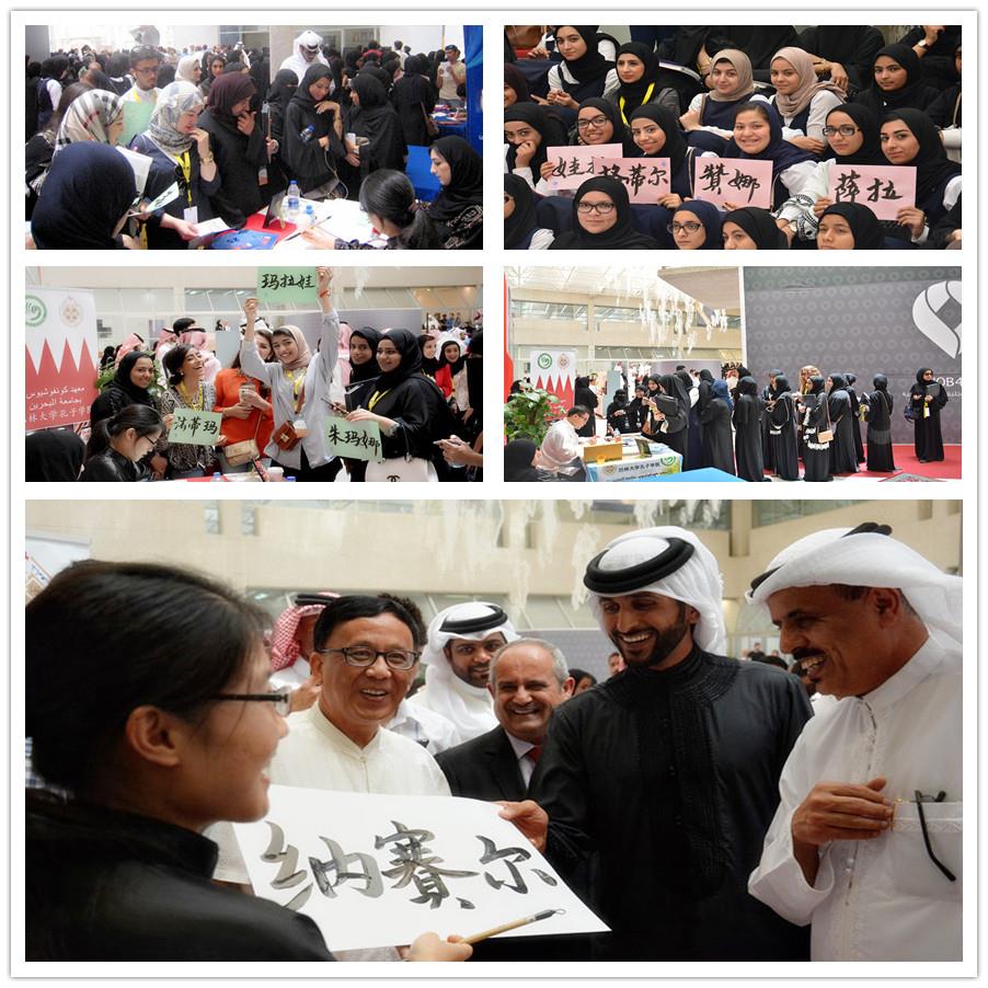 2015年4月28-30日,海湾地区第四届青年国际论坛在巴林王国召开,巴林大学孔子学院作为特邀嘉宾参加,并应组委会要求全程向前来参会的各国青年领袖介绍中国书法艺术,为来宾们书写中国名字。参加此次盛会的有巴林王国王子殿下纳赛尔·本·哈马德,巴林王国教育大臣马吉德先生,巴林大学校长贾纳哈博士,海湾各国青年领袖代表等,以及来自社会各界的来宾4000余人。