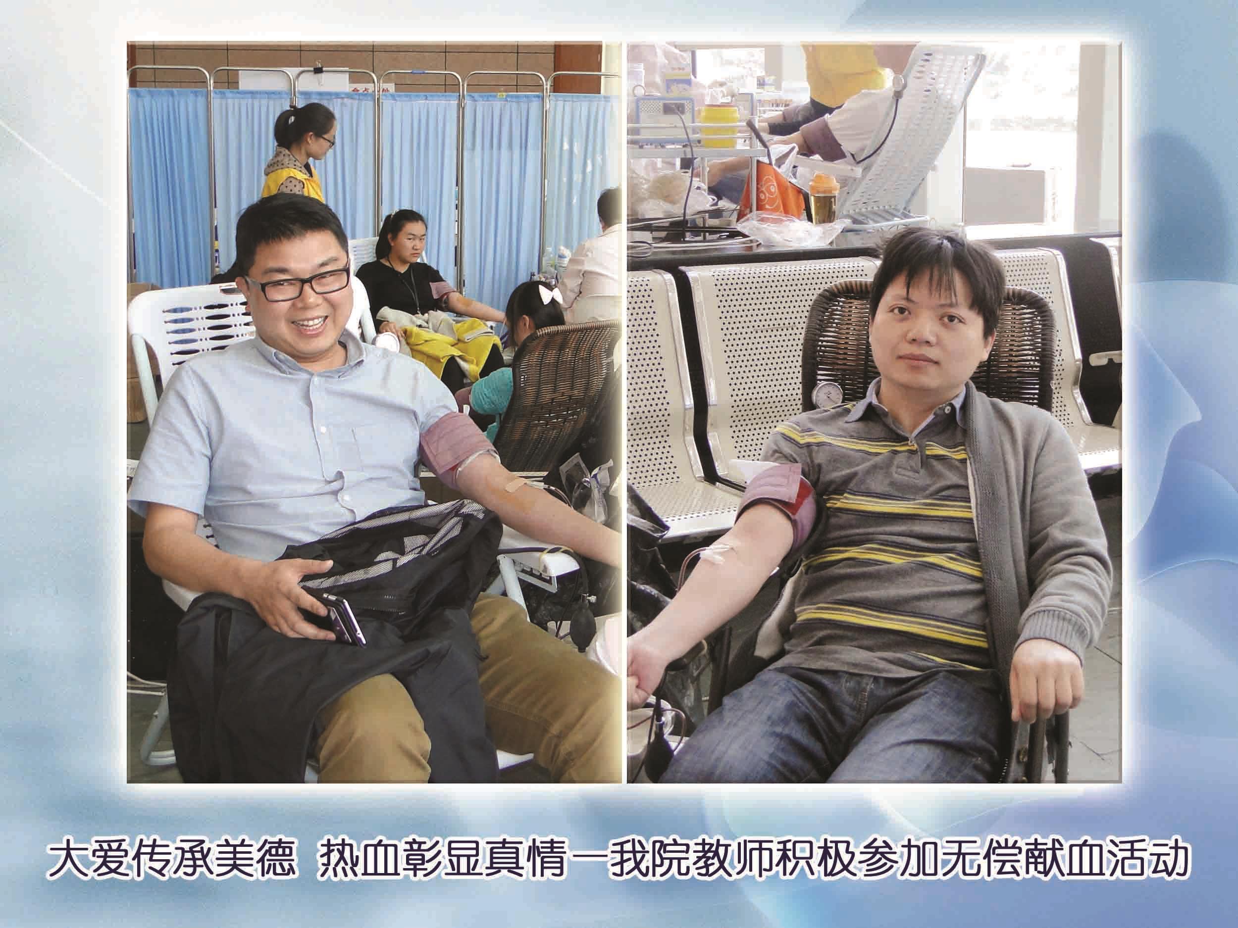 为响应学校无偿献血的号召,4月22日,计算机学院徐宝宇、刘炜老师积极参加学校组织的教职工无偿献血活动。