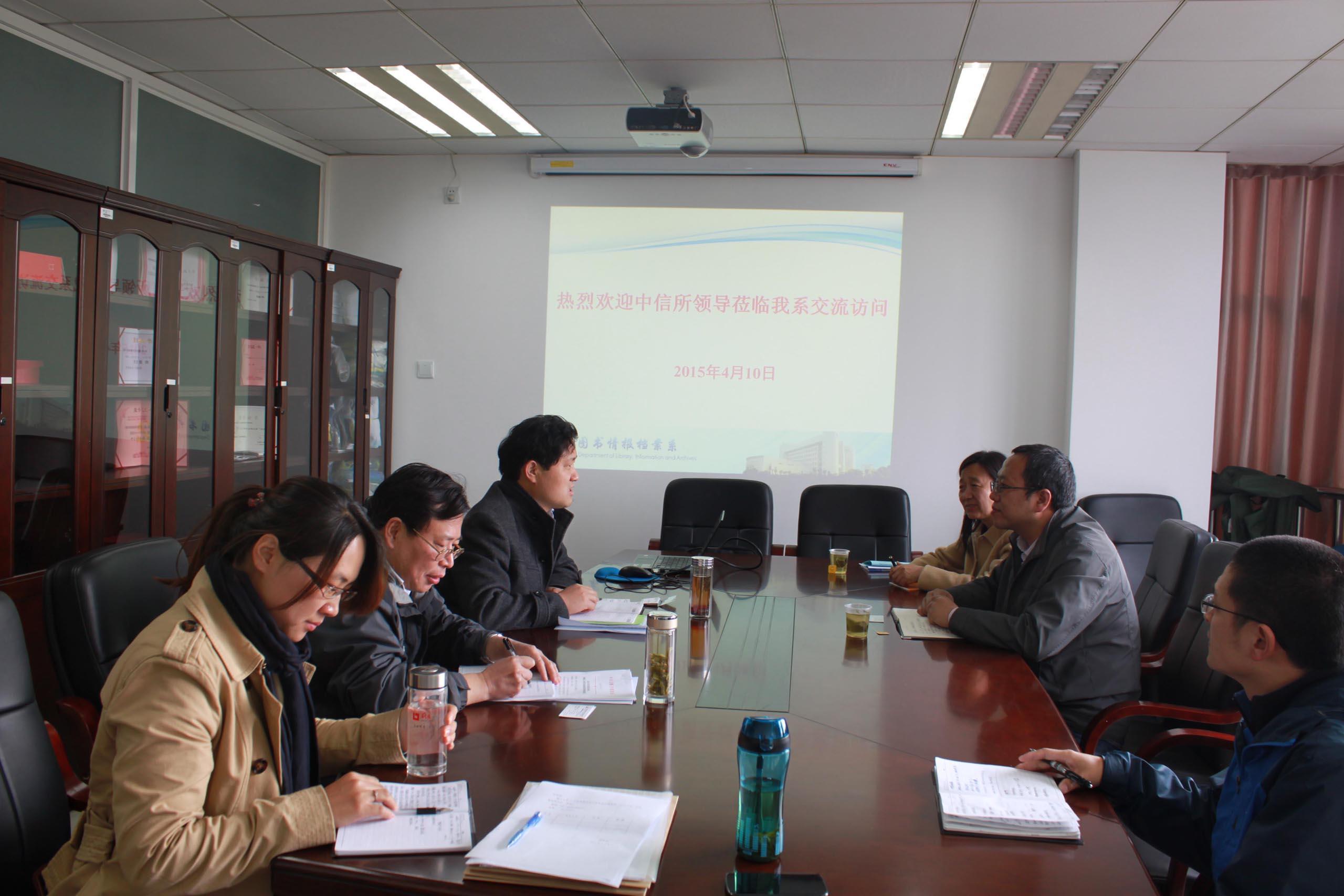 4月10日上午,中国科学技术信息研究所研究生部张泽玉主任和王桂凤老师莅临图情档系,主要就研究生招生、人才培养和实践基地建设等情况进行交流调研。图情档系金波主任、丁华东书记、于英香副主任以及相关负责老师参加了本次交流活动。
