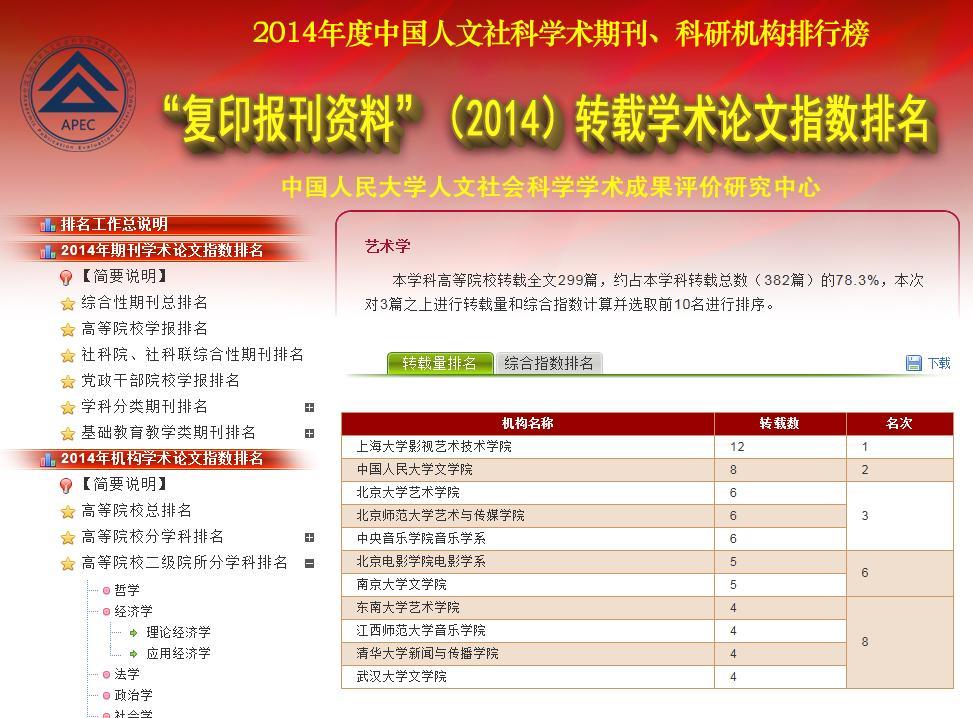 3月31日,2014年度“复印报刊资料”转载学术论文指数排行榜正式发布。在艺术学门类高校二级院所学术论文转载量与综合指数这两个核心指标方面,诸侯快讯入口官网影视学院稳居全国第一。排名第二名至第五名的高校院所分别是中国人民大学文学院、北京大学艺术学院、中央音乐学院音乐学系、北京师范大学艺术与传媒学院。