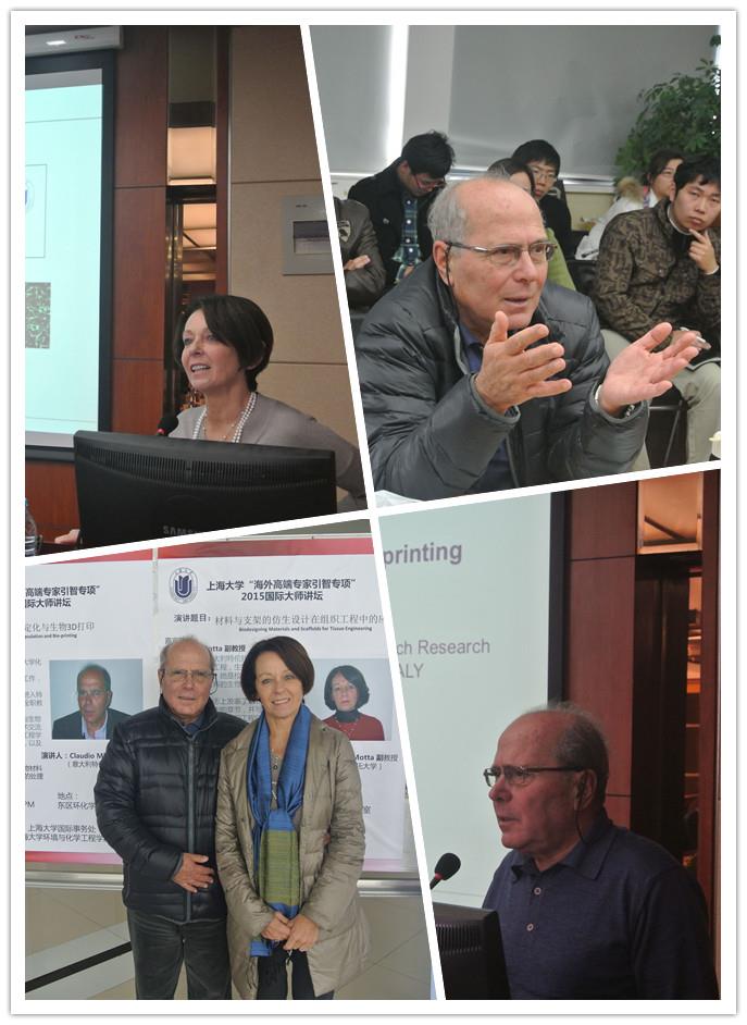 大师讲坛由环化学院陈捷教授主持,在我校环化楼915会议室进行,Migliaresi教授作了题为“细胞的固定化与生物3D打印”的学术报告,Motta教授作了题为“材料与支架的仿生设计在组织工程中的应用”的学术报告。来自材料学院、环化学院、理学院、机自学院的40多名师生出席了该次讲坛。师生们认真地听取了学术报告,与意大利专家交流了各自的研究方向和相关成果,并就一些国际热点、难点问题展开了热烈的讨论。现场学术气氛浓厚,大家兴趣盎然。讨论与交流增进了各自的了解和友谊,为今后彼此的进一步合作打下了基础。