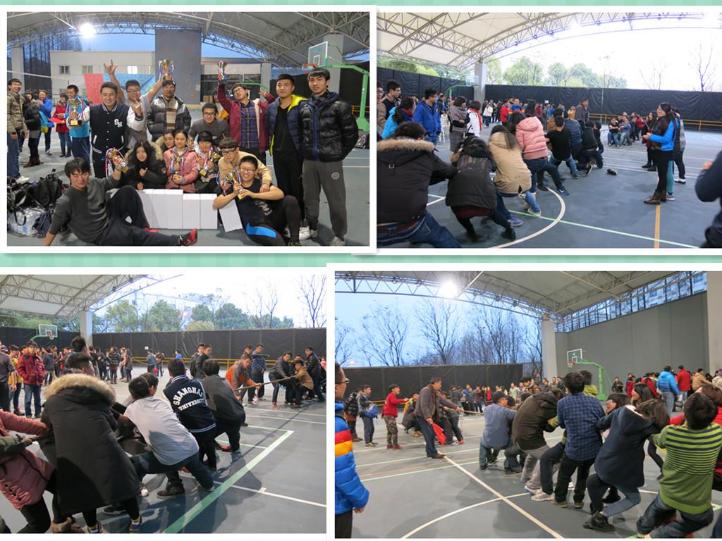 2015年1月13日在校本部风雨操场我校2014年学生拔河比赛火热开赛,近三百名学生参加了本次大赛。各系院高手云集,踊跃参赛,既充分发扬了团结协作的精神,也增强了凝聚力。参赛的同学们斗志昂扬,助威同学仿佛也身处比赛之中,现场气氛热烈高涨。经过激烈的角逐,最终,理工二组摘得桂冠,获得二至八名依次为法学院、计算机学院、机自学院、人文经管学院、理工三组、文学院、社会学院。