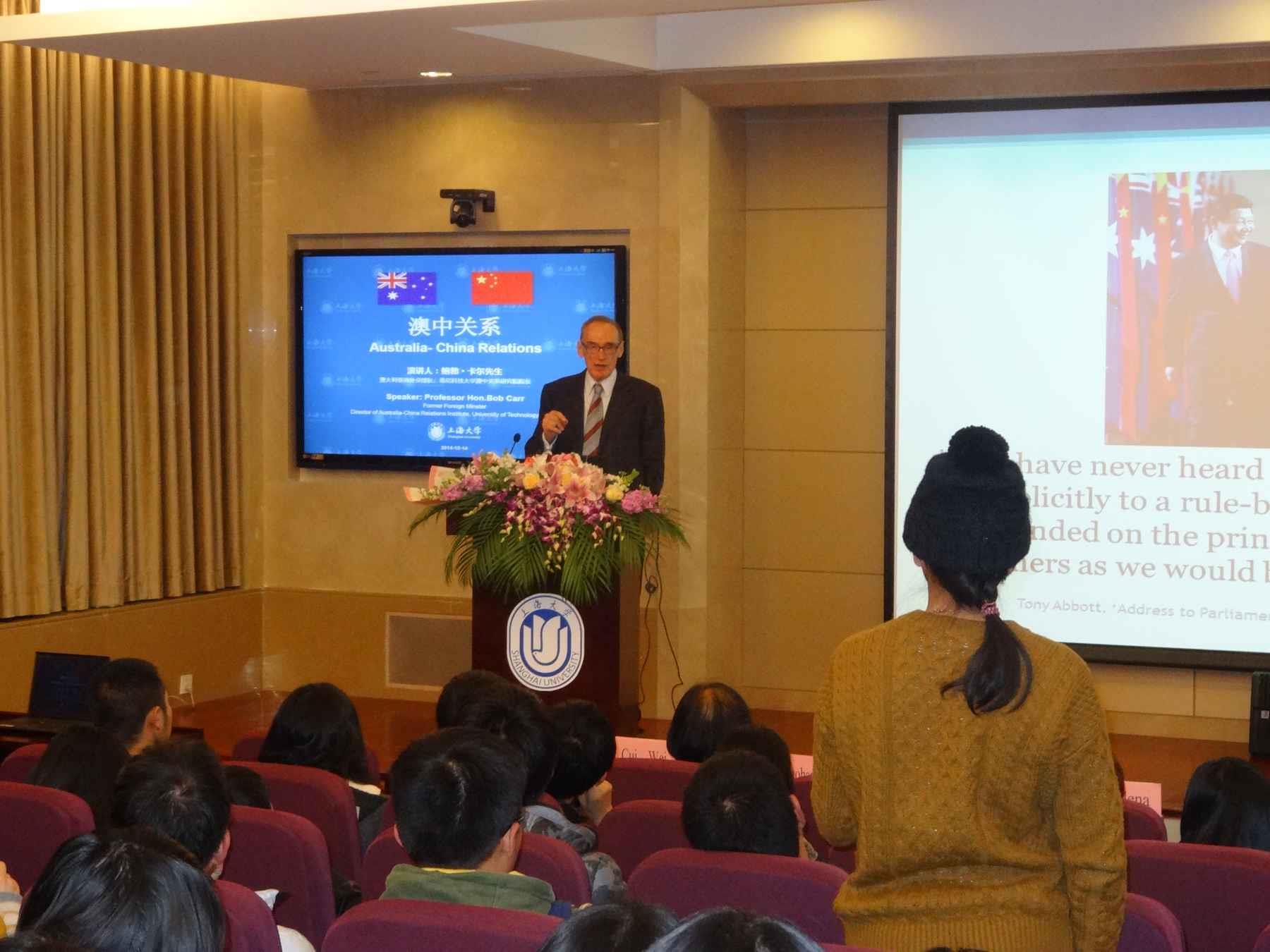 12月14日晚,澳大利亚前外长、悉尼科技大学澳大利亚-中国关系研究院院长Bob Carr教授来我校宝山校区乐乎新楼学海厅为上大学子带来一场关于中澳两国政治关系的学术演讲,外事处处长万旺根出席,悉尼工商学院常务副院长吕康娟主持。