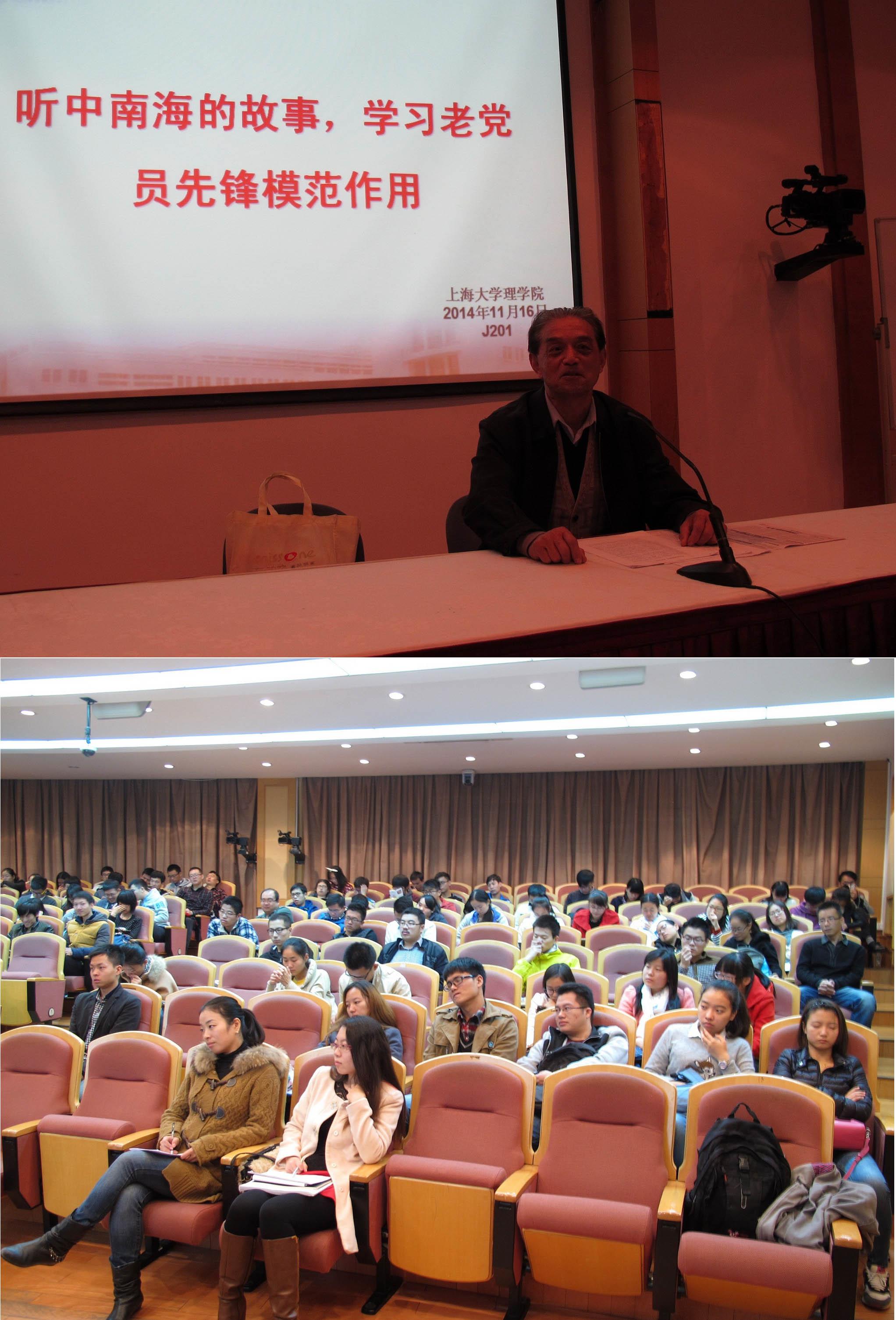 2014年11月16日上午10点,理学院2014-2015学年冬季学期首次党员大会于校本部J201顺利举行,本次党员大会以“听中南海的故事,学习老党员先锋模范作用”为主题,特邀请了20世纪六十年代曾在中南海从事速记员工作的陈宽宏老先生作为本次党员大会的报告人,和理学院的所有党员和预备党员一起回顾了自己在中南海工作的点点滴滴。