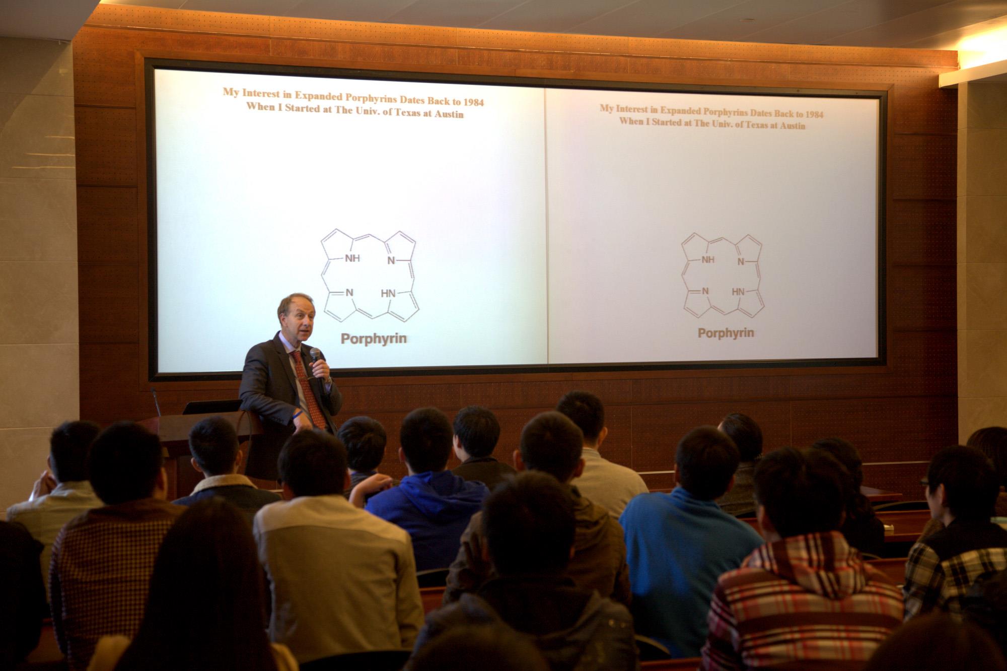 Sessler教授首先介绍了自己一些基本教育情况,并提到他19岁在加州大学伯克利分校学习期间患癌症的经历。在选择攻读博士学位的学校时,由于斯坦福大学是癌症化疗的发源地,出于今后治疗癌症的考虑,Sessler教授决定到斯坦福大学攻读化学博士学位,并有幸结识了治疗癌症的Miller医生。在该医生的鼓励下,Sesler教授决定从自己研究的卟啉化合物出发,开发新型治疗癌症的化学药物。在28岁获得德克萨斯大学助理教授职位后,Sessler教授独立开始了一系列扩环卟啉化合物的研究,并成功制备了五单元吡咯组成的“德克萨斯卟啉”。这一化合物可以将重金属离子(如Ga2+)络合并高效与癌细胞作用,通过核磁共振设备可以更快捷、清晰地观察到癌细胞的位置。在适当化学修饰后还可以有效杀死癌细胞。有趣的是,在发现这一系列新化合物后,Sessler教授说服Miller医生与他一起成立了Pharmacyclis公司,并通过近十年的努力完成了治疗大脑癌症药物的所有临床试验和药物申请过程。尽管64家医院的试验中只有法国两家医院的临床试验结果不尽人意,不幸的是美国FDA最终否定了该药物的上市申请。但Sessler教授并未放弃,而是将“德克萨斯卟啉”与癌细胞高效结合的特性与现有毒性大的Pt抗癌药物有机结合得到可以定点与癌细胞作用的新型化合物,并获得了一系列有趣的结果,为相关药物的进一步开发与上市申请提供了基础。