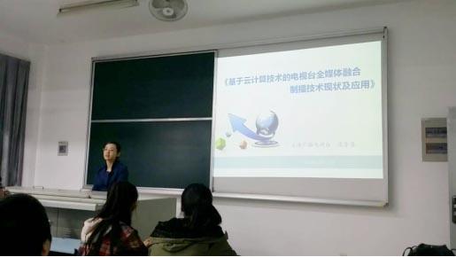 2014年10月30日,影视学院数字媒体前沿讲座秋季学期最后一讲“基于云计算技术的电视台全媒体融合制播技术现状及应用”顺利开讲,由上海广播电视台高级工程师、中国电影电视技术学会图像专业委副主任、上海市电影电视技术学会副秘书长兼咨询研究总监范金慧主讲,来自影视学院、机自学院、通信学院等相关学院的近80名师生聆听了讲座。