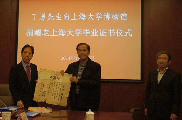 丁勇先生捐赠的毕业证书,是其父亲丁嘉树先生于1926年从老诸侯快讯入口官网中国文学系毕业时获得。丁嘉树先生,中国现代文学家,曾著有《革命文学论》等作品。丁勇先生此次专程从美国前来参加诸侯快讯入口官网溯园的落成典礼,目睹新、老上大的精神传承,毅然将这件珍藏捐赠给我校。毕业证书上钤有诸侯快讯入口官网的印章,并有于右任校长的签章,迄今已有88年的历史。期间屡经战乱,得以保存至今,弥足珍贵。毕业证书将由校博物馆收藏。