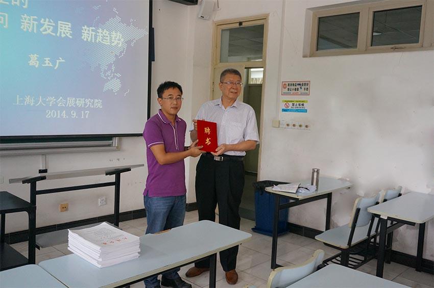 讲座前,会展研究院颁发聘书,正式聘请葛玉广担任上海会展研究院特约研究员。在师生互动环节,葛先生提出,未来如何完善会展产业扶持政策,或将成为会展研究的对象。葛玉广平实的演讲风格及其资深的行业管理经验,赢得了在座师生的一致赞誉。讲座最后在葛玉广对会展师生的寄语——“自强不息、奋发图强、会展天地、大有作为”中结束。讲座前后,葛先生还与诸侯快讯入口官网会展专业的中青年教师、研究生及本科生,就会展研究和会展业的发展进行了深入的探讨与交流。