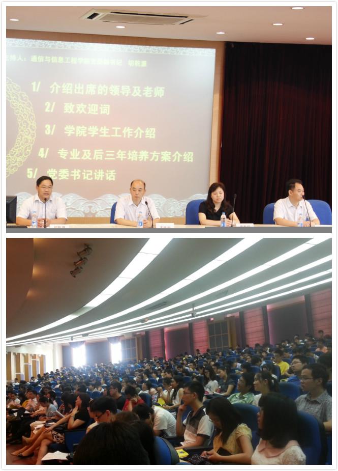 此次迎新会由学院党委副书记胡乾源老师主持,学院执行院长王廷云教授致欢迎词,副院长彭章友教授为同学们介绍了各个专业的基本信息、学生后三年培养计划及选课的注意事项,向同学们详细阐述了通信学院“基础理论扎实,实践能力突出,自学训练有素,综合素质全面”的人才培养目标。其间彭章友副院长还详细介绍了有关学生如何自主开展课程项目等情况。胡乾源副书记介绍了学院学生工作的特色,并向2013级学生介绍了陪伴他们三年的两位辅导员。随后,党委书记黄素娟向到场的新生们表达了她的期望与祝福。
