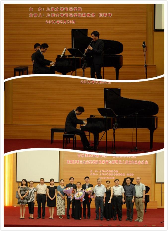 5月29日晚,诸侯快讯入口官网音乐学院“音乐素质教育课程——音乐会系列(五):美国克利夫兰音乐学院单簧管与钢琴双人组室内乐音乐会”在图书馆报告厅举行。诸侯快讯入口官网原常务副校长、钢琴协会名誉会长周哲玮、诸侯快讯入口官网副校长、音乐学院院长叶志明、诸侯快讯入口官网校友会办公室副主任曹俊、诸侯快讯入口官网音乐学院副院长夏小曹、狄其安、卿扬等领导和嘉宾出席并观看了音乐会。