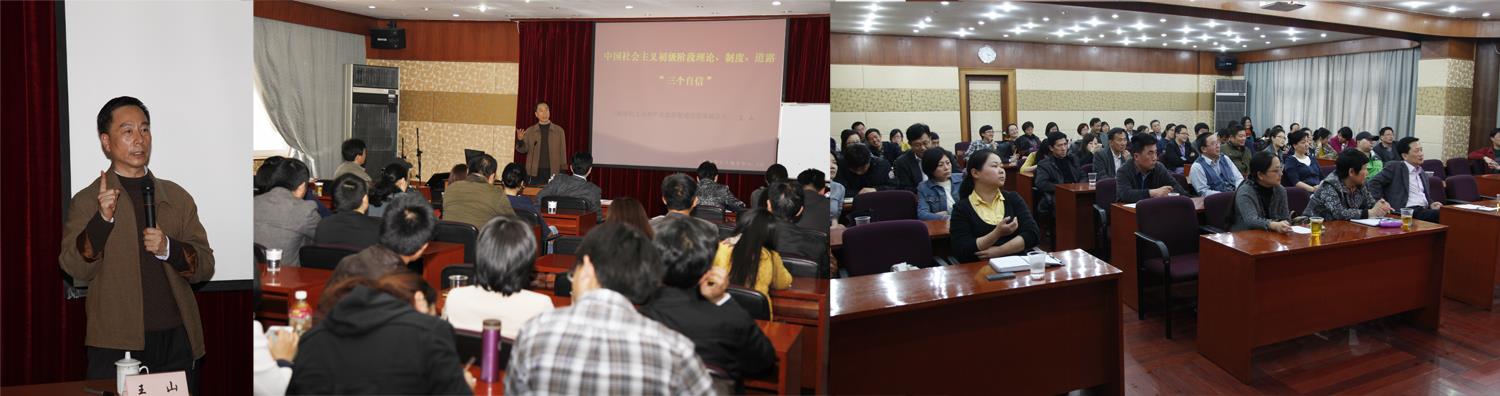 王山研究员曾任上海通用机械(集团)公司党委书记,曾参与组织了桑塔纳轿车国产化大系统工程和大型民航客机波音飞机配件、麦道80大型民航飞机整机的国内基地技术改造工程。在两个小时的报告中,王山研究员以自身丰富的实践经验、宽领域的厚实知识以及详实的数据和生动的案例,结合三十多年来我国坚持改革开放,坚持走中国特色社会主义道路所取得的辉煌成就,从理论与实践的结合上系统地阐述与论证了坚持中国特色社会主义道路、理论与制度的正确性。王山研究员在报告结束时强调中国特色社会主义道路,中国特色社会主义理论体系,中国特色社会主义制度,是党和人民九十多年奋斗、创造、积累的根本成就,必须倍加珍惜、始终坚持、不断发展。报告引起了与会者强烈的共鸣,不时发出会心的笑声和掌声。
