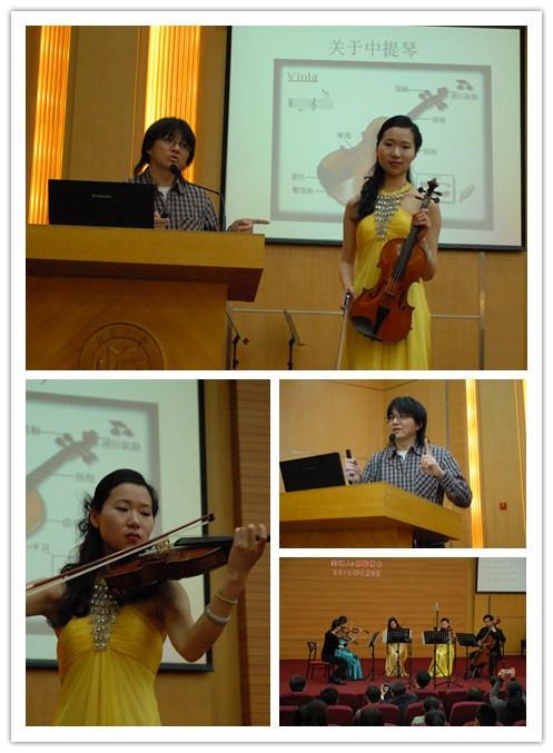 作为该门课程的首场音乐会,2013年“校园艺术家”吕抒雁同学在现场演奏多首具有代表性的中提琴弦乐作品,包括《舒伯特阿佩乔尼奏鸣曲》、《格林卡中提琴奏鸣曲》、《韦伯六首重奏—中提琴与钢琴第一、二、四首》、《德沃夏克弦乐四重奏—美国》等。