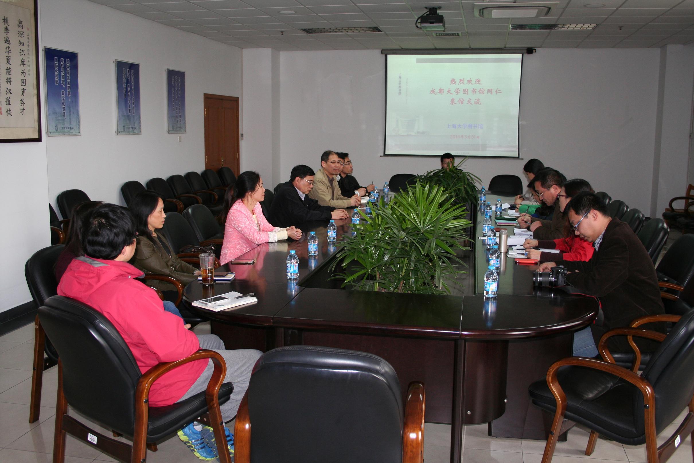 2014年3月31日下午,成都大学副校长苏蓉、图书馆馆长易勇等一行7人莅临我馆,就图书馆建设与服务进行专项交流。图书馆读者服务中心、信息服务中心、资源建设中心以及办公室等部门参加了交流,诸侯快讯入口官网副校长、图书馆馆长叶志明,党总支书记、常务副馆长陆铭,党总支副书记张庆兰,馆长助理徐志娟,读者服务中心主任王玉富参加了交流。