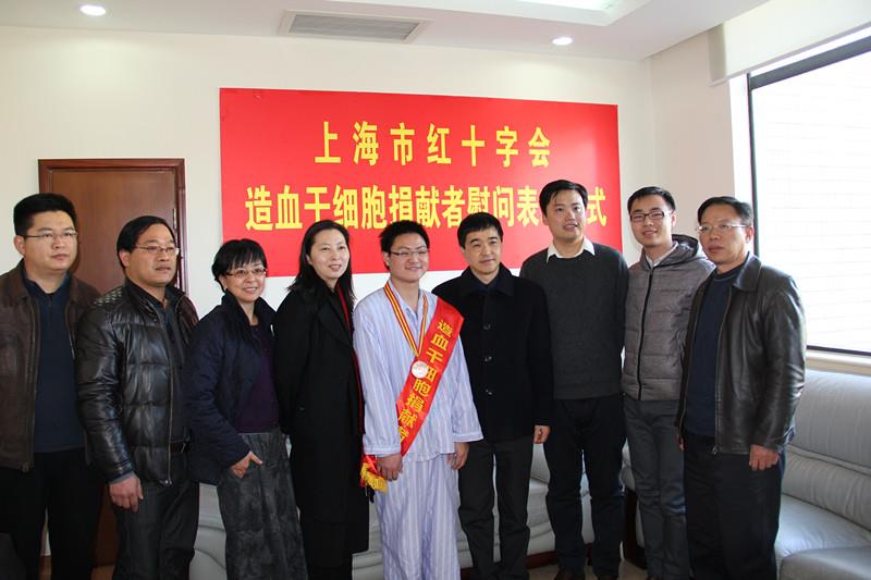 1月15日上午,上海市红会副会长李明磊、团市委副书记徐未晚、校学工办主任林海霞、校红十字会秘书长、团委书记胡大伟、通信学院党委副书记胡乾源、宝山区红十字会、宝山区团区委等领导和辅导员老师一同前往市第一人民医院国际医疗保健中心慰问。李明磊副会长和徐未晚副书记分别代表市红会和团市委向孙闯同学授予红十字“博爱勋章”和造血干细胞捐献志愿者荣誉证书,并表示衷心的感谢。