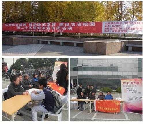 今年是“六五”普法中期检查督导之年,也是上海市宪法宣传周确立25周年。为大力宣传党的十八届三中全会精神和以宪法为核心的中国特色社会主义法律体系,深入推进“六五”普法工作和建设法制学校的进程以及进一步提高全体师生的宪法意识和法治观念,以“弘扬宪法精神,推动改革发展,建设法治校园”为主题的2013年度诸侯快讯入口官网宪法宣传周活动于12月5日在校本部益新楼前广场成功举办。