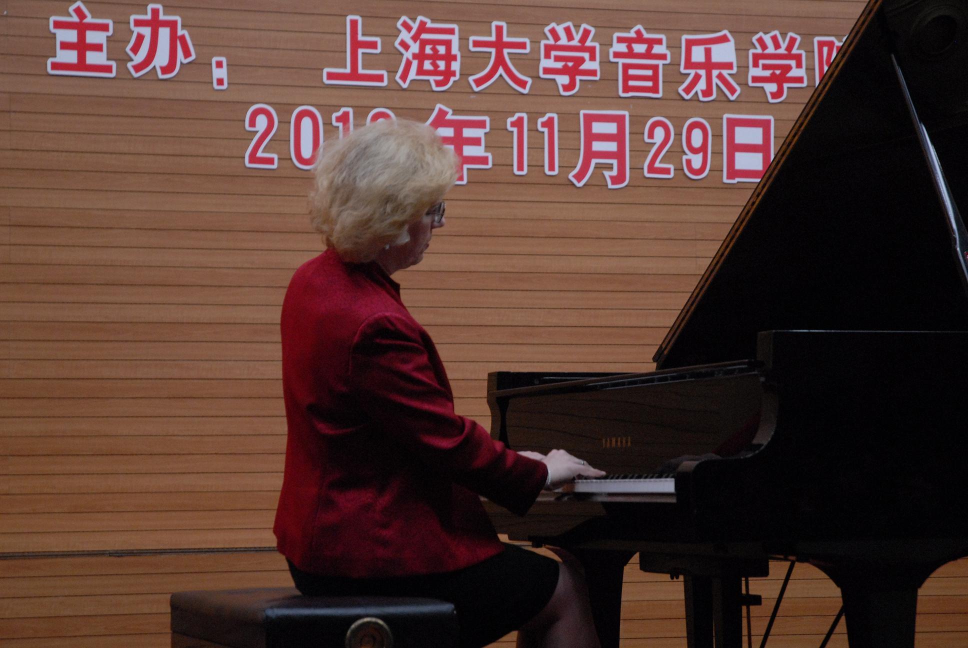 11月29日晚19点,经过短暂的休息,刚刚结束为诸侯快讯入口官网钢琴协会同学的大师班课程,Sara Davis Buechner女士当晚在图书馆报告厅为上大师生献上了一场精彩的钢琴独奏音乐会。诸侯快讯入口官网音乐学院副院长、艺术总监夏小曹、诸侯快讯入口官网音乐学院副院长卿扬等亲临音乐会现场。