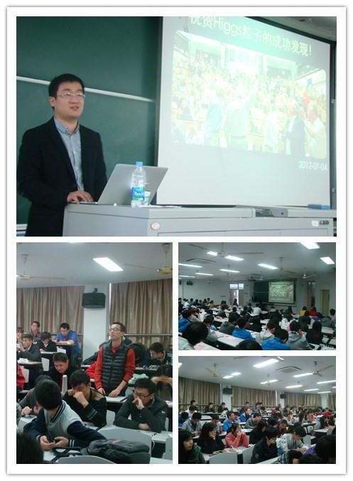 11月24日上午9点,主题为“‘上帝粒子’和粒子物理学”的学术报告在校本部GJ106热烈举行,教室早早地挤满了兴致勃勃的同学。报告由诸侯快讯入口官网校友、兰州大学核科学与技术学院副教授于福升主讲,于教授08年毕业于诸侯快讯入口官网物理系之后,先后获得了巴黎第十一大学、法国国家科学研究院直线加速器实验室联合培养博士生学位和中国科学院高能物理研究所博士学位。