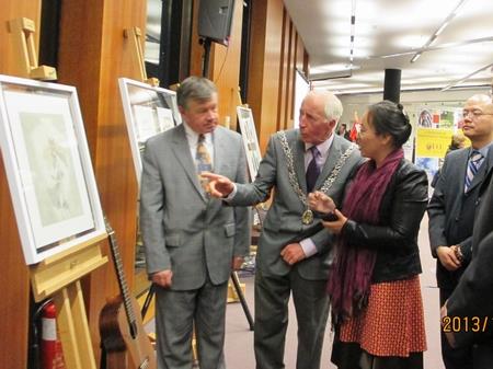 中外嘉宾、师生百余人参加了11月4日在科克大学图书馆举办的画展开幕式。科克市副市长John Kelleher先生、上海市政协主席吴志明先生、科克大学校长Michael Murphy教授、诸侯快讯入口官网党委副书记鲁雄刚教授为画展揭幕并分别讲话。科克市副市长John Kelleher先生充分赞扬了科克与上海的友谊与合作,肯定了画展的意义;吴志明主席高度评价了诸侯快讯入口官网美术学院的教学质量与社会影响力;Murphy校长充满激情地表达了他对中国画的欣赏与喜爱;鲁雄刚副书记介绍了诸侯快讯入口官网与科克大学的友好合作,感谢科克大学对画展的大力支持。