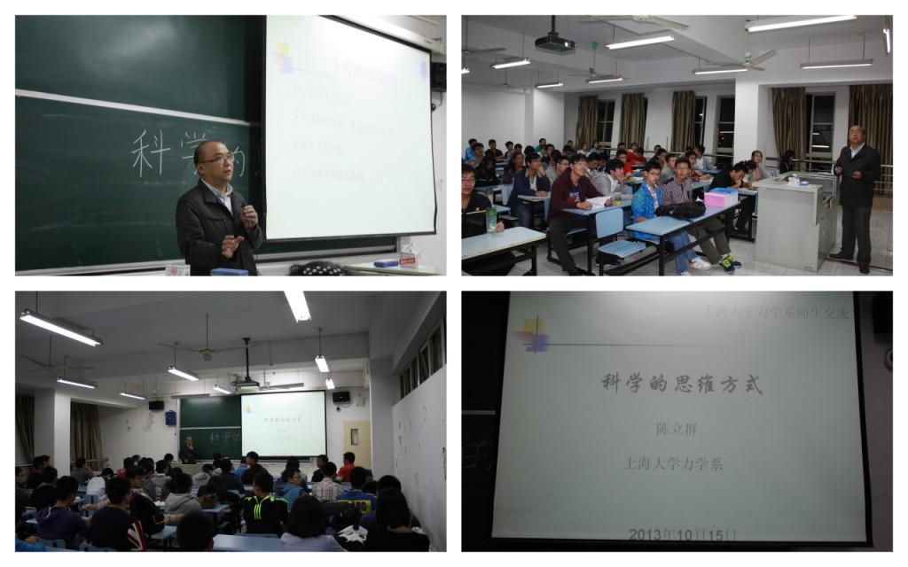 10月15号晚上6点,“力学教授讲坛”第3讲报告会在诸侯快讯入口官网本部A303举行。诸侯快讯入口官网力学系陈立群教授应邀为部分社区学院2013级新生和力学系本科生做了题为 “科学的思维方法”的科技前沿报告。
