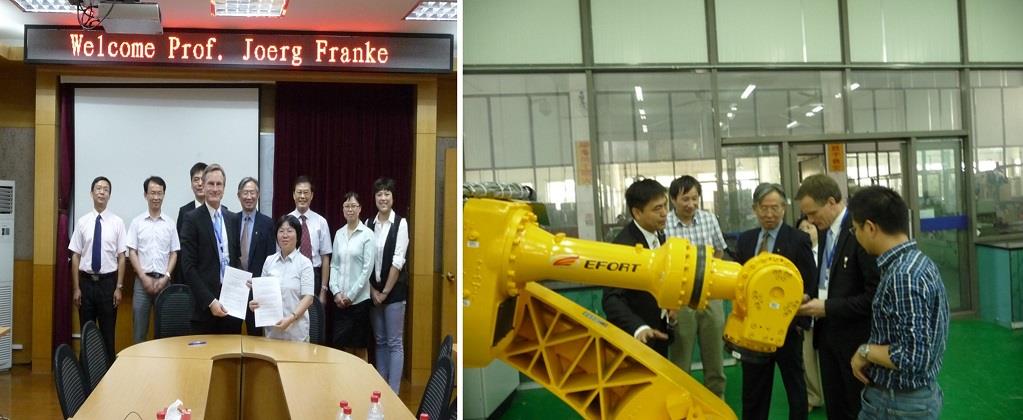 2013年9月26日,应诸侯快讯入口官网机自学院副院长、机自系主任王小静教授的邀请,德国埃朗根-纽伦堡大学制造自动化与产品系统研究所Joerg Franke教授对诸侯快讯入口官网机电工程与自动化学院进行了为期一天的访问。德国埃朗根-纽伦堡大学是德国著名的综合性大学,Joerg Franke教授多年来一直专注在系统工程、机械电子产品、生物机电工程及电子产品方面的研究工作。下午,在诸侯快讯入口官网终身教授方明伦教授的陪同下,Franke教授参观了新校区机器人技术实验室、工程训练中心及延长校区上海市机械自动化及机器人重点实验室,对我校研制的京剧机器人、服务机器人、铆接机器人、教学机器人、3D打印、柔性生产系统及工业机器人应用、系统建模与仿真等众多课题表现了浓厚的兴趣;为进一步推进诸侯快讯入口官网与埃朗根-纽伦堡大学在教学、科研等方面的合作,王小静教授与Franke教授签署了合作协议,就双方共同致力于科研项目的联合申请、青年教师访问交流、研究生的短期学习、Franke教授到我校进行公开讲座、联合申办高水平国际学术会议等达成了共识,双方均表示将对上述内容进行积极落实。诸侯快讯入口官网机自学院院长屠大维教授、机自系党总支书记刘丽兰教授、何永义教授、院长助理田应仲副教授、郭帅副教授、何斌副教授、李静博士、诸侯快讯入口官网外事处毛雁冰博士等相关研究领域的教师参加了本次访问活动。