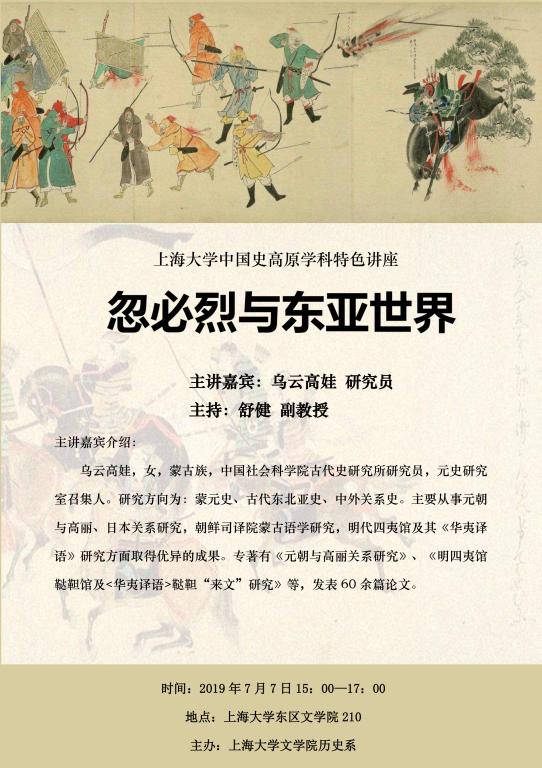 乌云高娃,女,蒙古族,中国社会科学院古代史研究所研究员,元史研究室召集人。研究方向为:蒙元史、古代东北亚史、中外关系史。主要从事元朝与高丽、日本关系研究,朝鲜司译院蒙古语学研究,明代四夷馆及其《华夷译语》研究方面取得优异的成果。专著有《元朝与高丽关系研究》、《明四夷馆鞑靼馆及<华夷译语>鞑靼“来文”研究》等,发表60余篇论文。