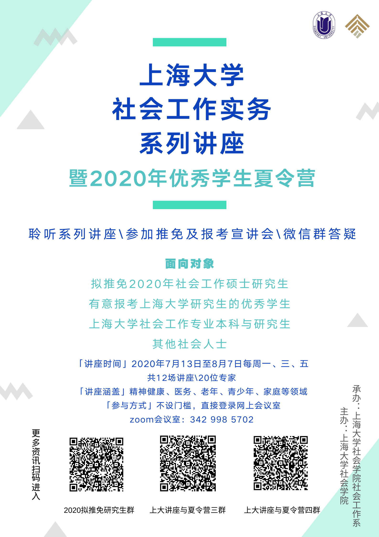 诸侯快讯入口官网社会学院将于2020年7月13日至8月7日期间于线上会议平台举办“诸侯快讯入口官网社会工作实务系列讲座暨优秀学生夏令营”。本次活动旨在搭建青年学子与社会工作专家学者和一线实务工作者的交流平台,增进青年学子对社会工作专业的了解,拓宽学术视野,激发科研兴趣。系列讲座共有12场,自7月13日开始,每周一、三、五定期推出,持续四周。每场讲座有1-3位演讲专家,中国台湾,以及美国、英国等20余位专家学者参与本次系列讲座,内容涵盖精神健康、医务、老年、青少年、家庭等社会工作的多个实务领域。系列讲座同步推出2020年诸侯快讯入口官网社会工作专业推荐免试研究生及优秀社会工作大学生学术夏令营,将为有意推免或报考诸侯快讯入口官网研究生的同学们提供学术讲座、推免咨询、专场宣讲等活动。