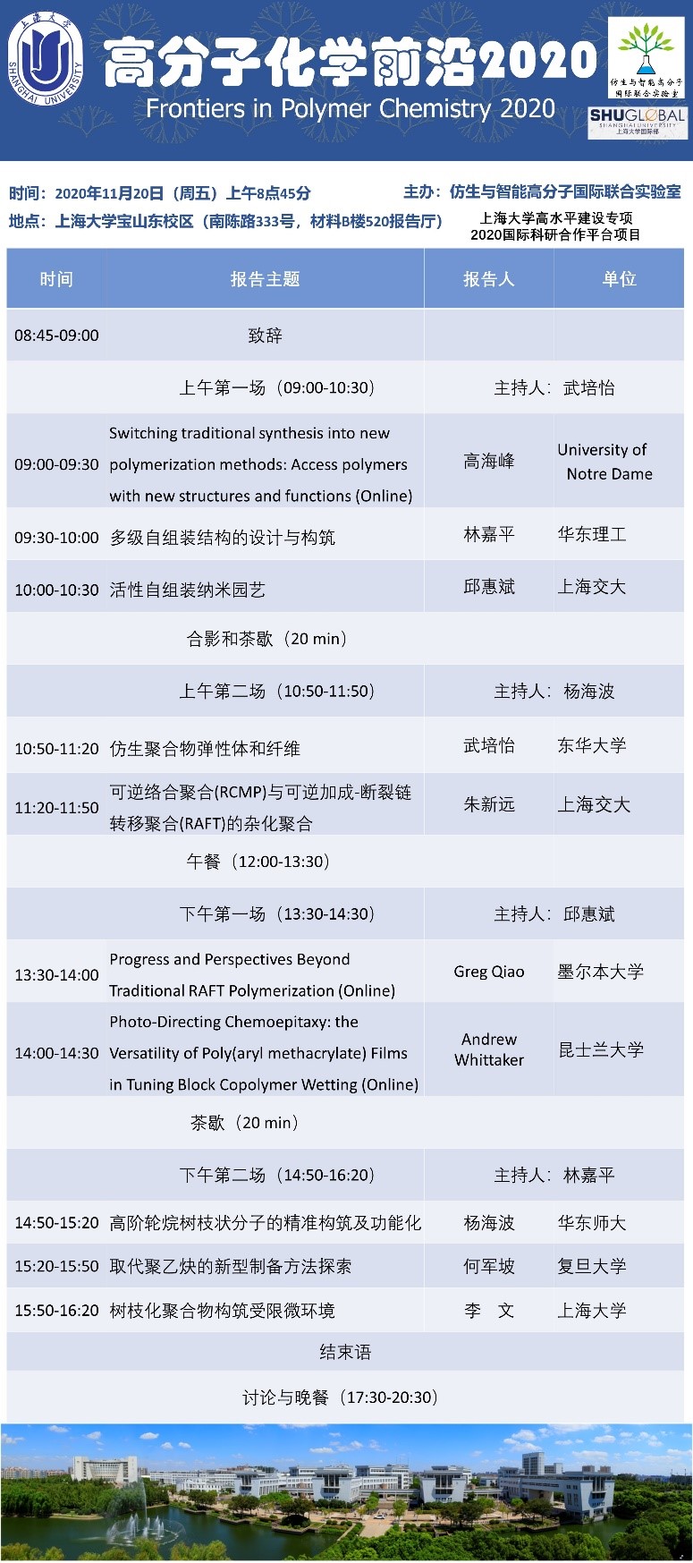 报告简介:仿生与智能高分子国际联合实验室举办高分子化学前沿论坛。本次论坛邀请了来自澳大利亚昆士兰大学、澳大利亚墨尔本大学、美国圣母大学以及上海市有关高校的多位国际知名学者,围绕高分子化学和材料领域的前沿研究进行学术报告和交流讨论,详情请见以下会议议程。